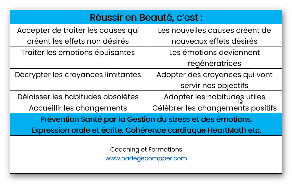 Dans tous les axes de santé que vous souhaitez régler, mon action sera sur les pensées, les croyances et les émotions qui vont vous aider à changer vos habitudes en aval (alimentation, addictions, habitudes de vie, habitudes sportives, relations, etc.). Et c’est à partir de ces changements que petit à petit, ou encore plus rapidement selon ce que vous en ferez, vous augmenterez les chances de rééquilibrer votre corps et votre vie ! Et Réussir en Beauté !