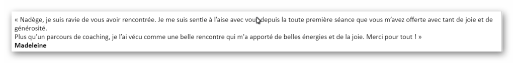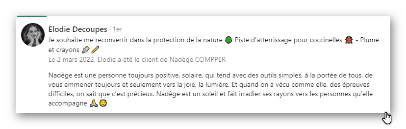 Nadège est une personne toujours positive, solaire, qui tend avec des outils simples, à la portée de tous, de vous emmener toujours et seulement vers la joie, la lumière. Et quand on a vécu comme elle, des épreuves difficiles, on sait que c’est précieux. Nadège est un soleil et fait irradier ses rayons vers les personnes qu’elle accompagne 🙏🌞