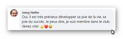 P.S. Si tu es un homme et que tu lis cette page, dans la galerie ci-dessus, tu as pu voir le témoignage de Joerg, désormais un ami, qui participait depuis l’Allemagne à l’une de mes précédentes idées, le Club La Joie du Succès. Pour l’instant, je me focalise sur la sororité. Nous inviterons des hommes de temps en temps, promis ! Nous savons que vous aussi, vous êtes des dieux et que le Nouveau Monde ne se fera pas sans vous mais avec vous, tous ENSEMBLE ! 🙂
